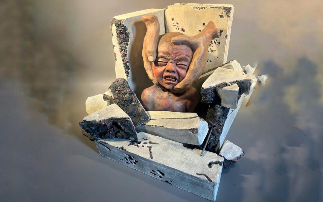 From Rubble Reborn invites reflection on birth, hope and humanity across borders. The work shows a baby emerging from rubble – fragile, sacred, universal. Who do the hands belong to?