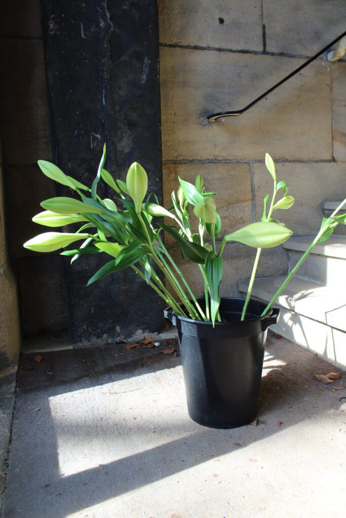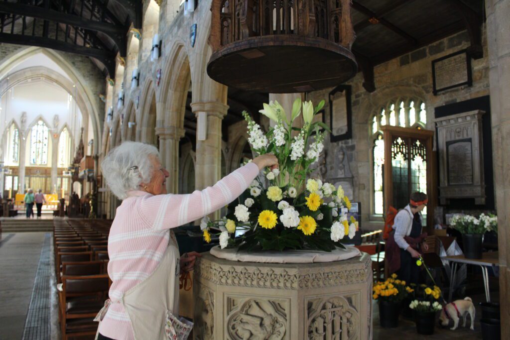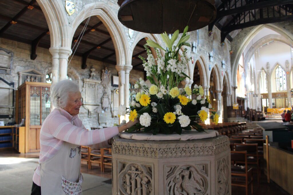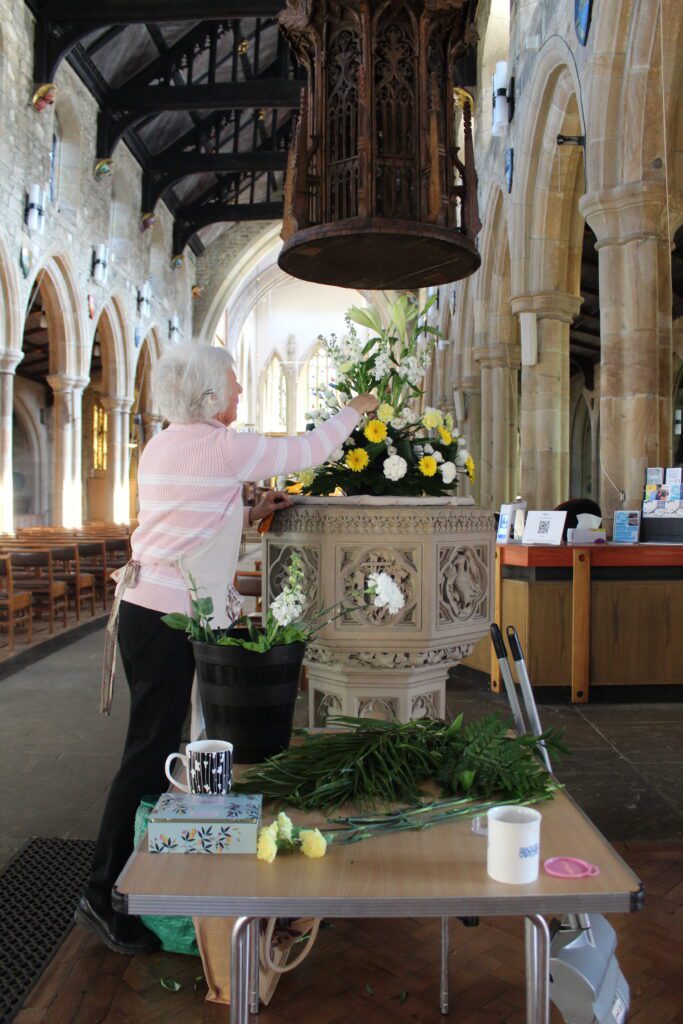 Thanks also go to our volunteer flower team, who work especially hard at this time of year. The photos below illustrate the many steps involved in putting the arrangements together. The lillies go into water several days before they are arranged, which allows the flowers to open up. You may have spotted them in buckets all across the building! Following this, they are carefully positioned into florist foam, which holds water to keep them fresh. Meanwhile, the font display gets carefully put together.